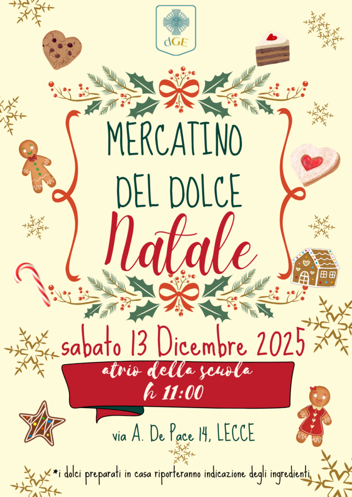 Il Mercatino sarà l’occasione per acquistare una vasta selezione di dolci natalizi artigianali preparati con cura dalla nostra comunità di genitori e volontari. Si potranno trovare torte, biscotti, pandori, cioccolatini e molte altre prelibatezze, ideali per arricchire la tavola delle Feste o per originali regali.